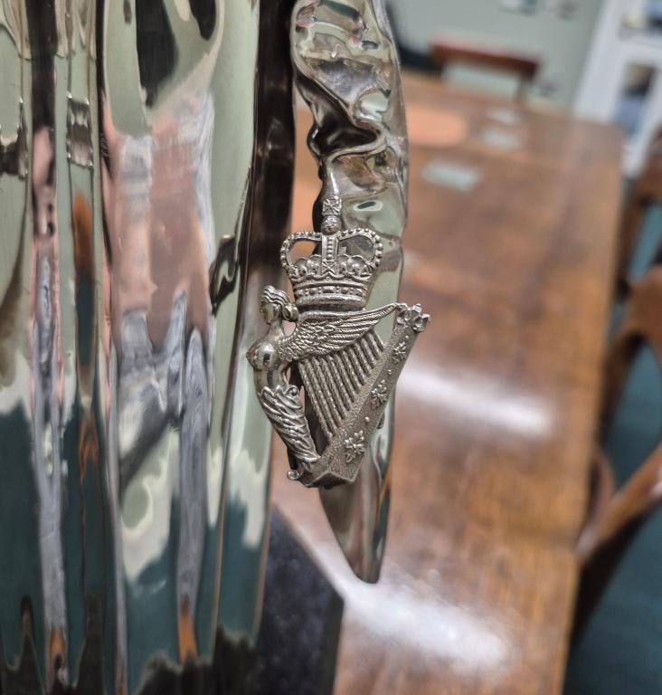 ‘The Grim Reaper’ is the property of the Roselawn Club, a dining club comprised of officers who served with the 3rd Battalion. The Club was formed following the funeral of a former member of 3 UDR at Roselawn cemetery. In coming together to remember his life, former officers realised how much they missed the camaraderie and lifelong friendships that had been formed whilst serving. Often it was only at funerals that everyone had a reason to once again meet up and share memories. In this moment, a dining club was established, which hosts several dinners each year to which former members are invited. As the funeral had been at the Roselawn Cemetery it was agreed that the cub would be known as The Roselawn Club, a reflection of soldiers’ dark humour.