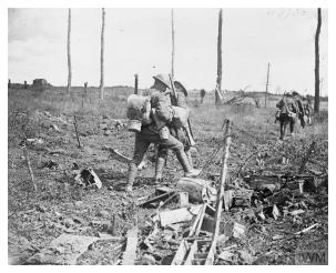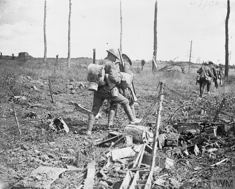 | The Advance in Flanders. Troops of the Royal Inniskilling Fusiliers, 36th Division, advancing from Ravelsburg Ridge to the outskirts of Neuve Eglise, 1 September 1918. |