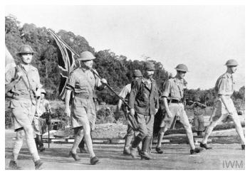 Lieutenant-General Arthur Ernest Percival, being escorted by a Japanese officer, with his party carrying both a flag of truce and the Union Jack, meets with the Japanese to negotiate the surrender of the Allied forces in Singapore. It was the largest surrender of British-led forces ever. The British Prime Minister, Winston Churchill, described it as 'the worst disaster and largest capitulation in British history'.