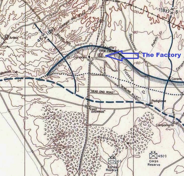 | Perimeter as at 5 Feb 44; note Carroceto, Aprilia and 'The Factory'. |