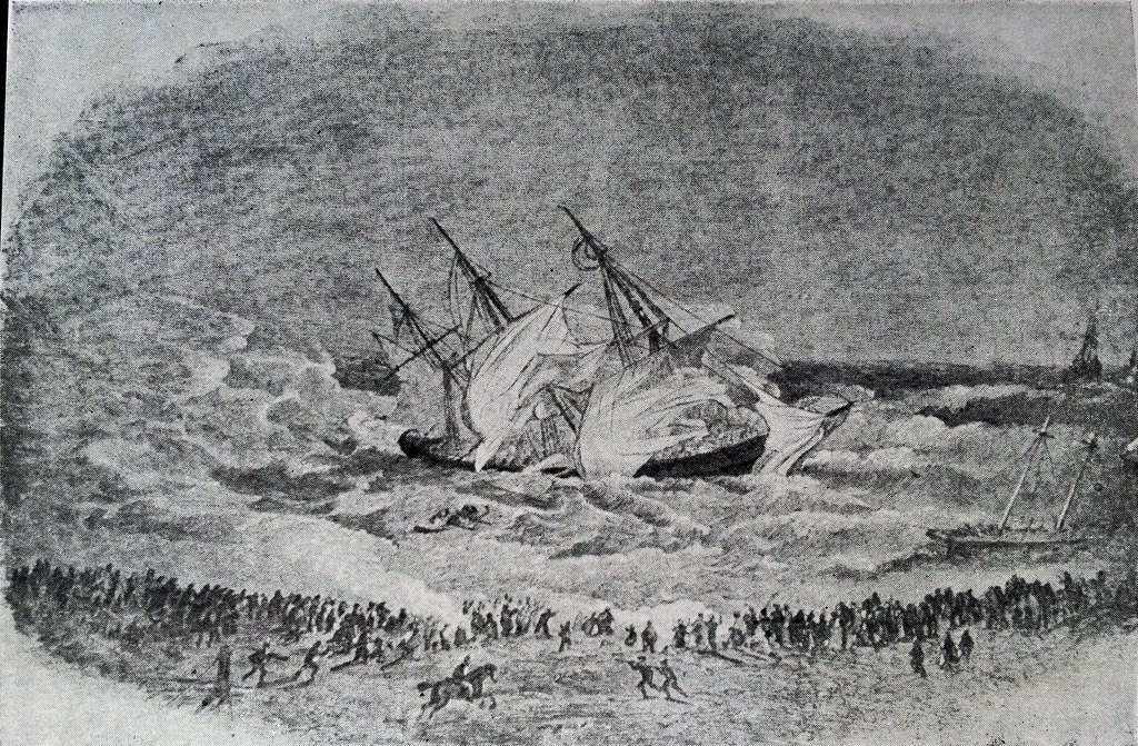 En route, she anchored off Port Elizabeth in Algoa Bay (South Africa) to resupply with casks of fresh water. On the evening of 20 September a gale began to blow and all were confined to their quarters and hammocks below with none allowed on decks above. Around 2000 hours, she broke her anchor lines and began to drift with the wind and waves and struck a reef. She was dashed heavily against the reef several times and began to break up.