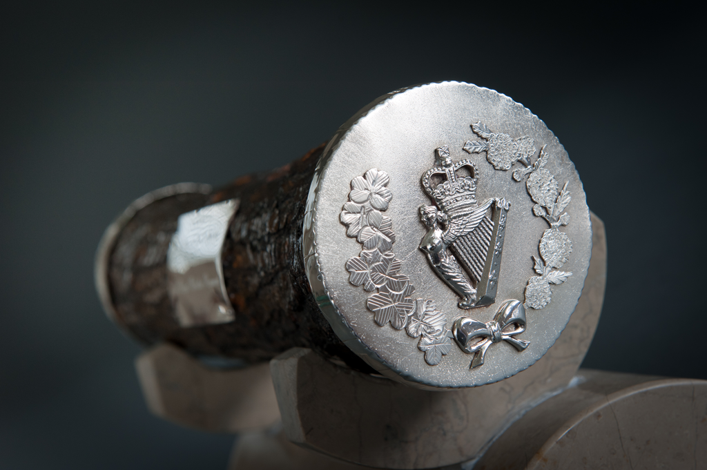 The piece representing a hollowed-out log with sterling silver caps at either end, one bearing the cap badge of The Royal Irish Regiment, the other the cap badge of The Royal Gibraltar Regiment, was commissioned to mark Royal approval for a formal alliance between the two Regiments. The scroll detailing the alliance is held in the hollowed-out centre of the log that rests on a marble pedestal.