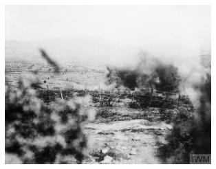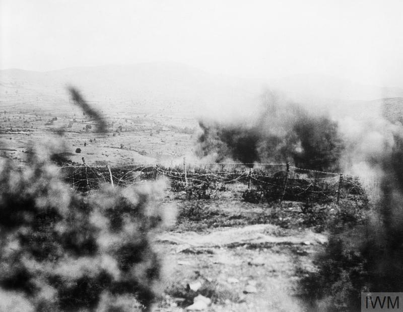 Bulgarian artillery shells bursting close to British positions near Doiran in Macedonia, August 1916. |