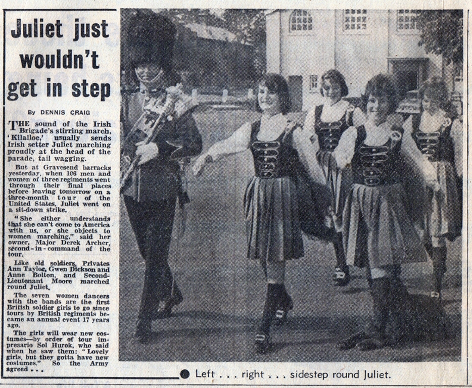 The very first copies of the SUN newspaper were sold on Tuesday 15 September 1964 and on page 9 there was an article concerning a red setter called Juliet, Major Derek Archer, and four Irish dancers about to embark on a British Army musical tour of the USA.
