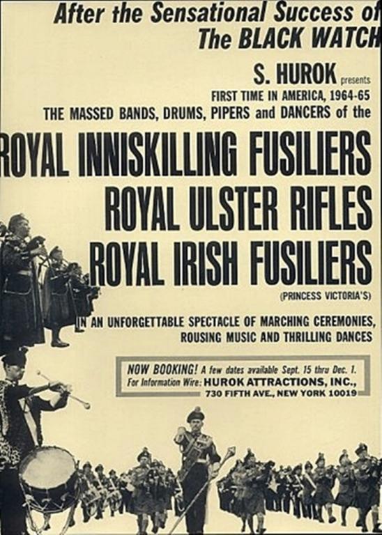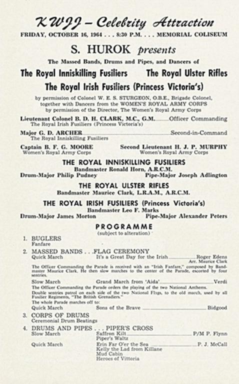 Major G D Archer was the Second in Command of the tour. The 1964 USA Tour was performed by the Massed Bands, Drums, Pipes and Bugles of The North Irish Brigade, and a troupe of Irish Dancers from the WRAC (Womens Royal Army Corps).