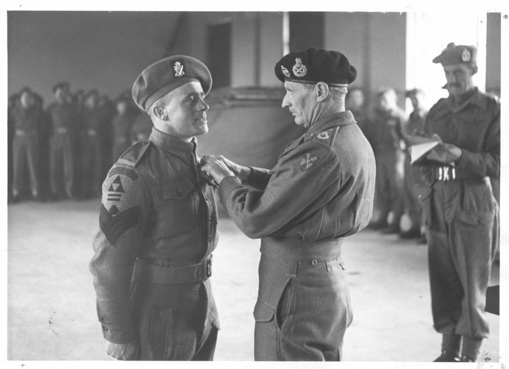 Colour Serjeant Sharkey receives his DCM ribbon from Field Marshal Montgomery. |