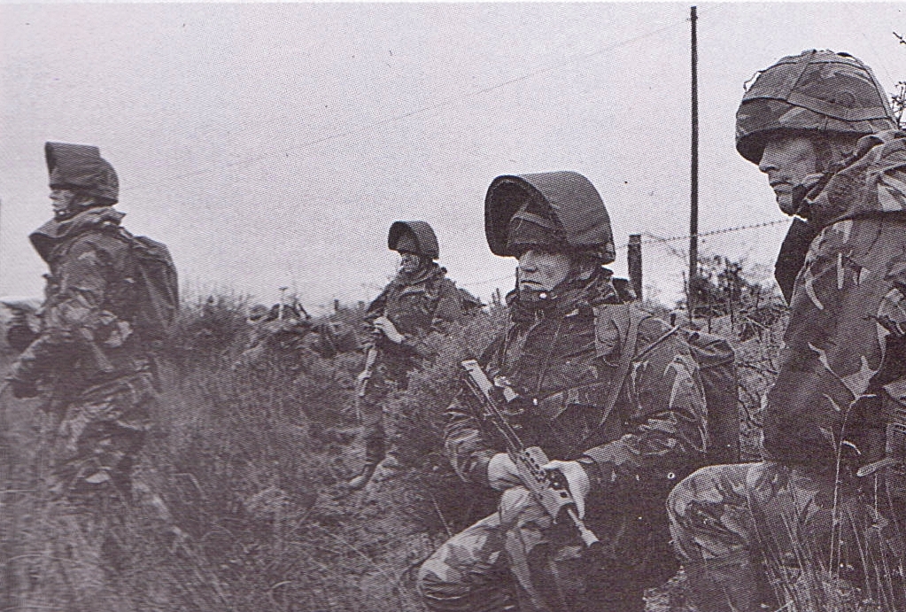 D Company deployed to Fermanagh after only six months since coming together as a company. Based on Support Company it consisted of the Mortar Platoon (10 Platoon), the Milan Anti Tank platoon (11 Platoon) and the Bugles, Pipes and Drums (12 Platoon). There were no major incidents in the company’s area during the tour and the platoons manned PVCPs at Gortmullan, Mullan Bridge, Rosscor Bridge and Boa Island. The traffic flow through these PVCPs was some 2,000 vehicles per day. The company also manned the most westerly security force base in Northern Ireland; RUC Belleek. Other company tasks included patrolling the 700 square kilometre area of responsibility deploying on foot, by vehicle and by Puma support helicopter.