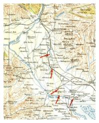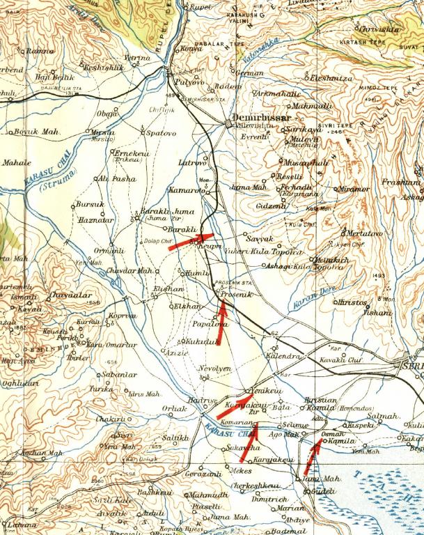 Seres to Salonika road crossing River Struma and the railway line from Dorian (Bulgars to the north). Spelling of locations on map vary; Jenikoj = Yenikeui |