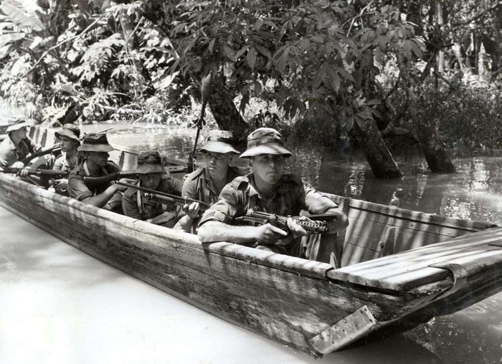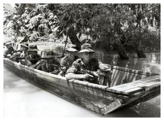 Complete in their locations further east and south by 22 May were A Company at Song, D Company at Bangkit and the Recce Platoon at Katibas. Living in company camps, patrols were sent out on foot, or deployed by boat and helicopter, to the Indonesian border to search for signs of incursion. The going cross country restricted movement often to less than 2km per day. The patrols also employed the local Iban people as trackers.