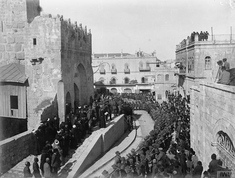 | General Allenby listening to the reading of the Proclamation of Occupation from the steps at the base of the Tower of David (El Kala, the Citadel) Jerusalem, 11 December 1917. |