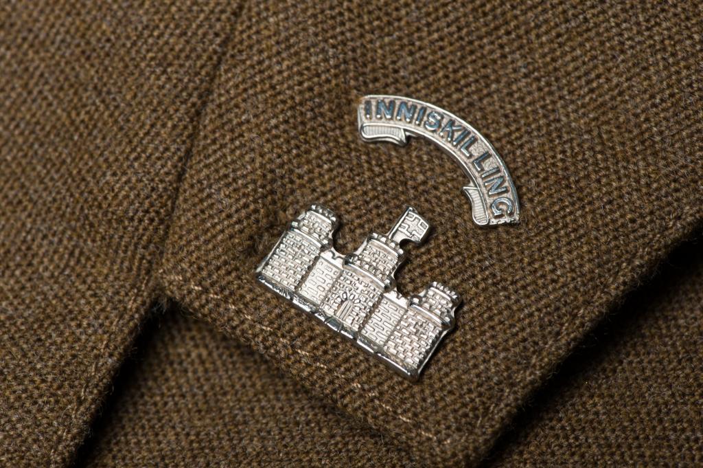 The origin of the badge worn on our collars goes back to when the Inniskillener-men were raised in 1689 as regiments of foot to defend the town of Enniskillen in County Fermanagh during the Williamite War. The spelling of the town we know today as Enniskillen originates from its Irish name Inis Ceithleann, (Isle of Kathleen). The Annals of Clonmacnoise stated that the isle took its name from Cethlen, the wife of Balor, Chief of the race of pirates known as the Formorians. Its name was anglicised with its spelling evolving since the English permanently captured Enniskillen Castle in 1607. However, the castle badge's origins are not Enniskillen Castle but the nearby Crom Castle after its beseiging Jacobite Army was defeated at the Battle of Newtownbutler on 31 July 1689.