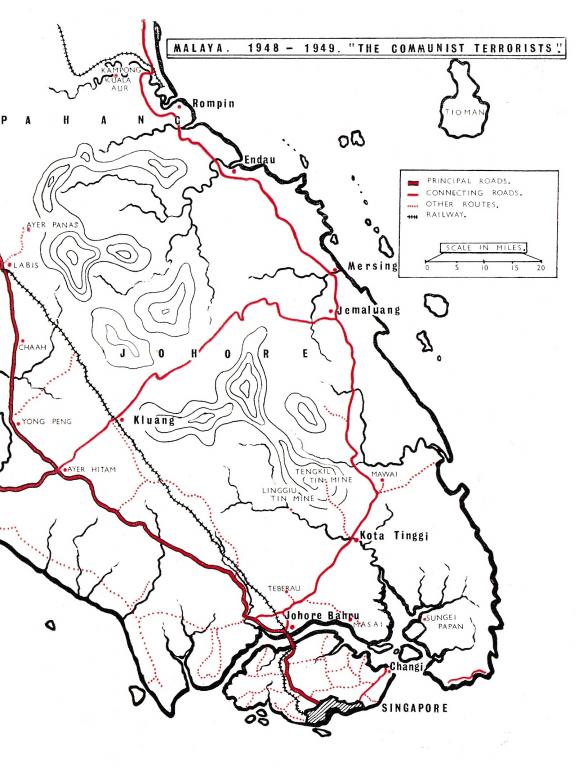 However, the Malayan communists were becoming active and one company was detached to Johore Bahru. Some operations were mounted from Singapore but with the deterioration of the security situation in Malaya, the Battalion moved in October 1948 to assume responsibility for South East Johore, an area half the size of Northern Ireland.