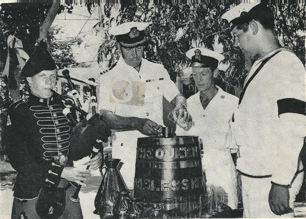 On many occasions, members of the Regiments have sailed on board HMS Bulwark, Brave, Antrim, Londonderry, Barrosa and Belfast while members of the ships companies have visited their affiliated regiments in many parts of the world. With the former Regimental Depot at Ballymena in County Antrim it was only natural that the Regiment would seek an affiliation with HMS Antrim and it was whilst on board her that the Colonel of the Regiment witnessed the Silver Jubilee Review at Spithead in 1977.